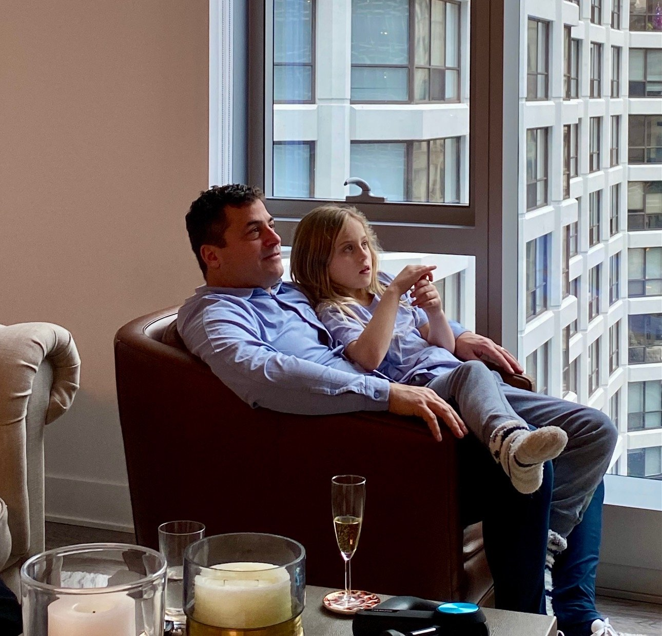 A man and a young girl sitting on a couch, watching television in a modern apartment with large windows and a city view.