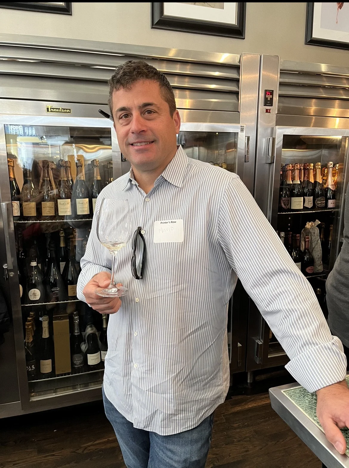A man with dark hair and light skin, wearing a white striped dress shirt, holding a glass of white wine, poses in front of a wine refrigerator filled with bottles. He has sunglasses hanging from his shirt collar and a name tag that reads 'Printer's Row' and 'Flavio.'